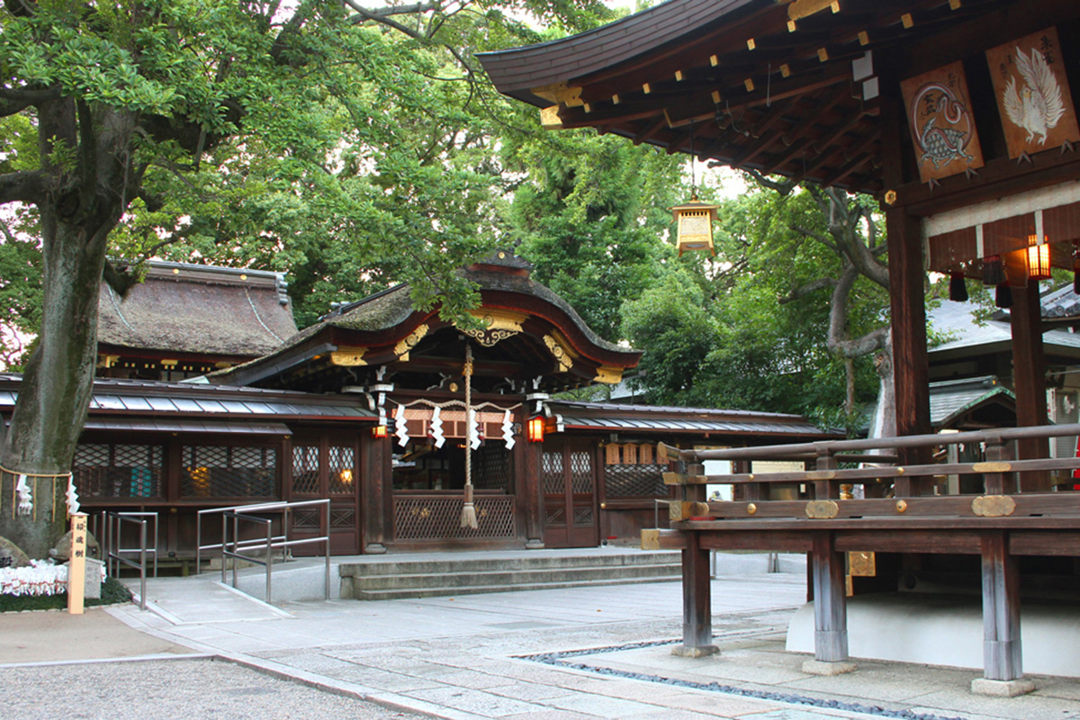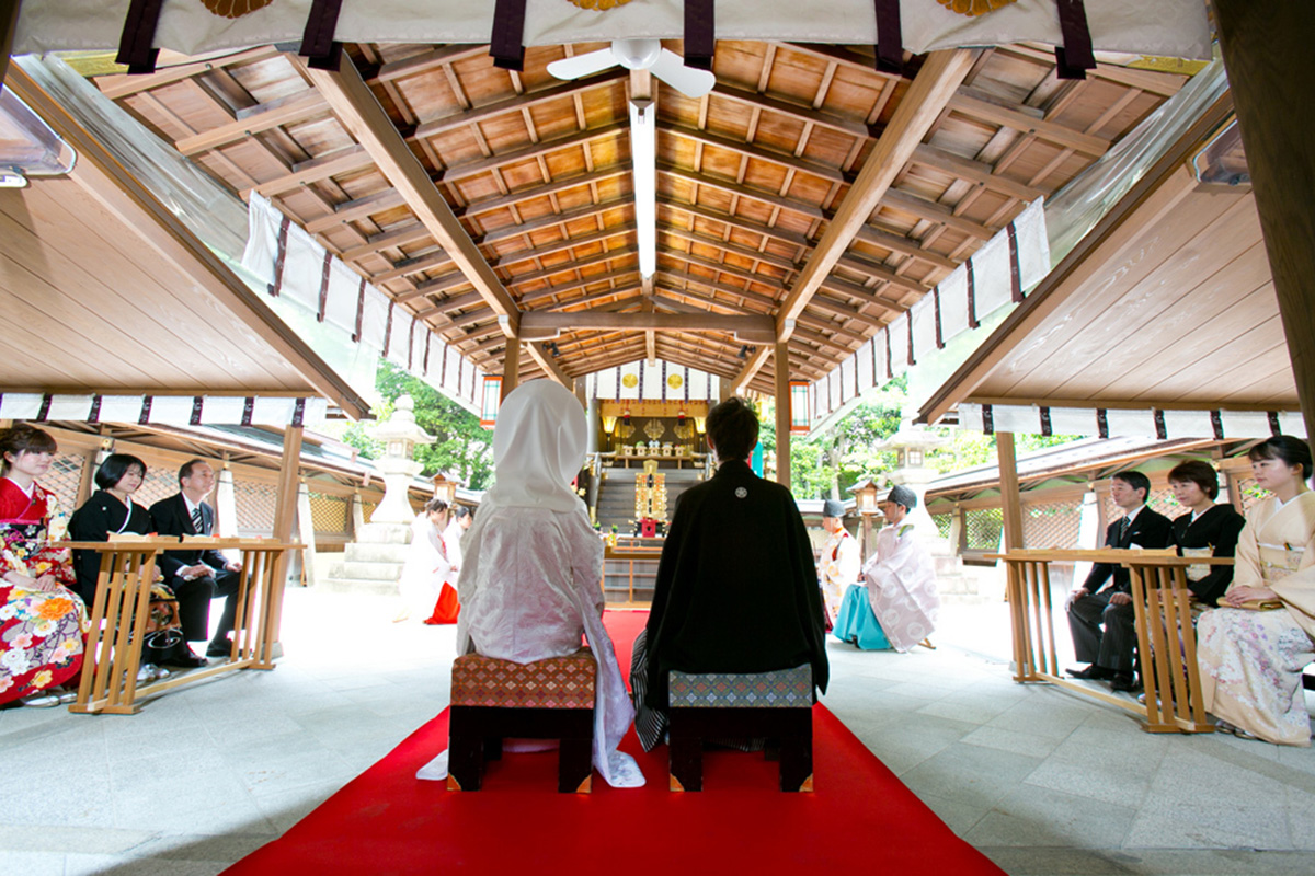 Renowned as a guardian deity for strong legs and safe mobility, this shrine attracts worshippers from all over Japan.Within the grounds stand sacred boar statues (komainoshishi) dedicated by devoted followers—welcoming visitors at the entrance in place of the more common guardian dogs. For this reason, the shrine is affectionately known as the “Boar Shrine.”Boars, which hold deep significance here, are symbols of fertility and vitality, and are believed to bring blessings for prosperity of descendants and safe child-rearing.A Shinto wedding ceremony at Goō Shrine unfolds in an atmosphere that is both solemn and elegant. As the rhythmic sound of drums resonates, the couple proceeds before the deities, while the refined melodies of gagaku (ancient court music) fill the sacred space.During the kagura dance, performed to pray for the couple’s everlasting prosperity (iyasaka), the ceremony reaches its most dignified and awe-inspiring moment.After the ceremony, couples may also enjoy a special plan featuring a graceful ride in the traditional rickshaw “Kotobuki-go,” offering an elegant stroll through the shrine grounds and the surrounding Kyoto Imperial Palace area.