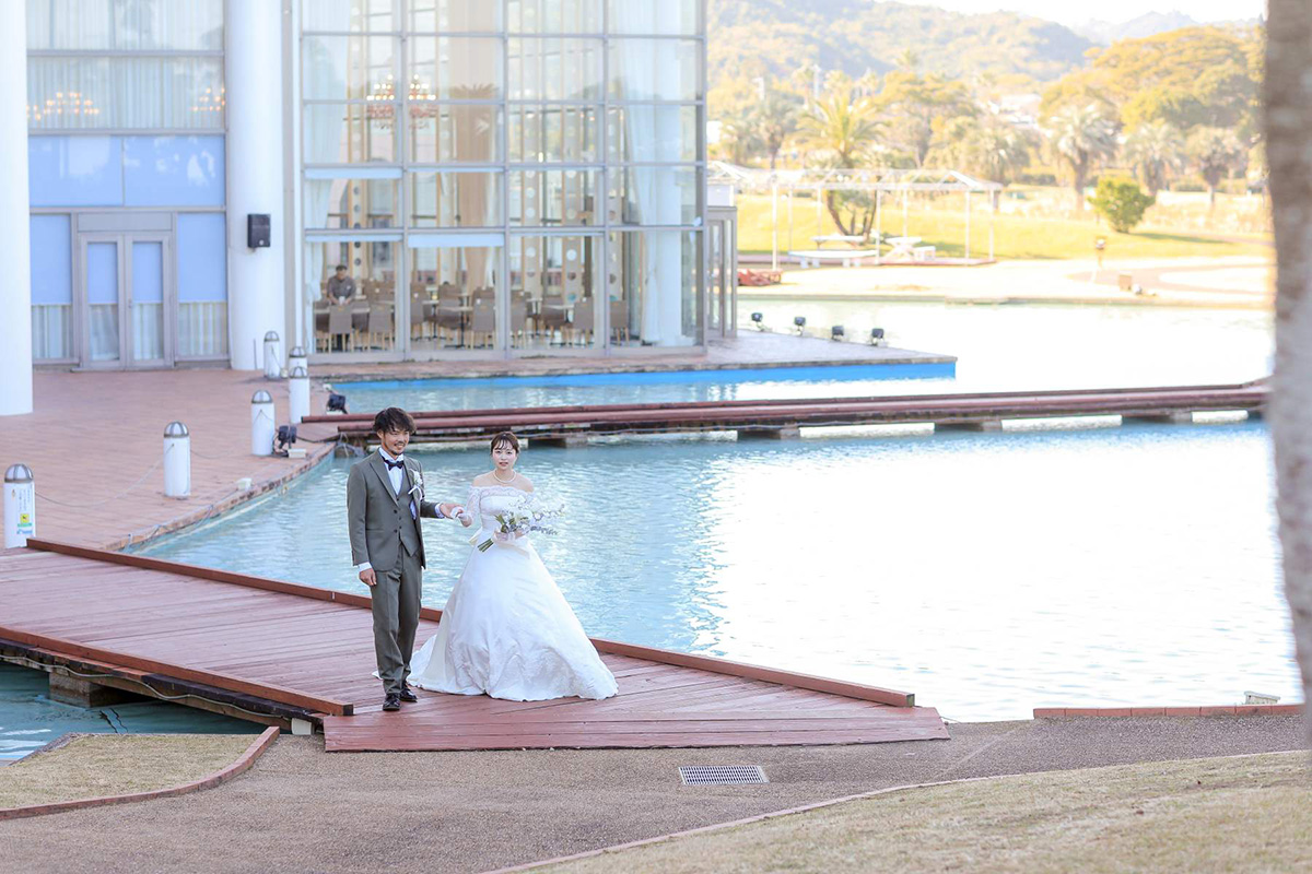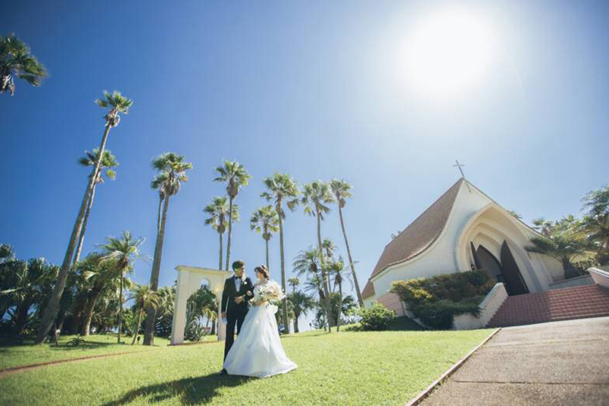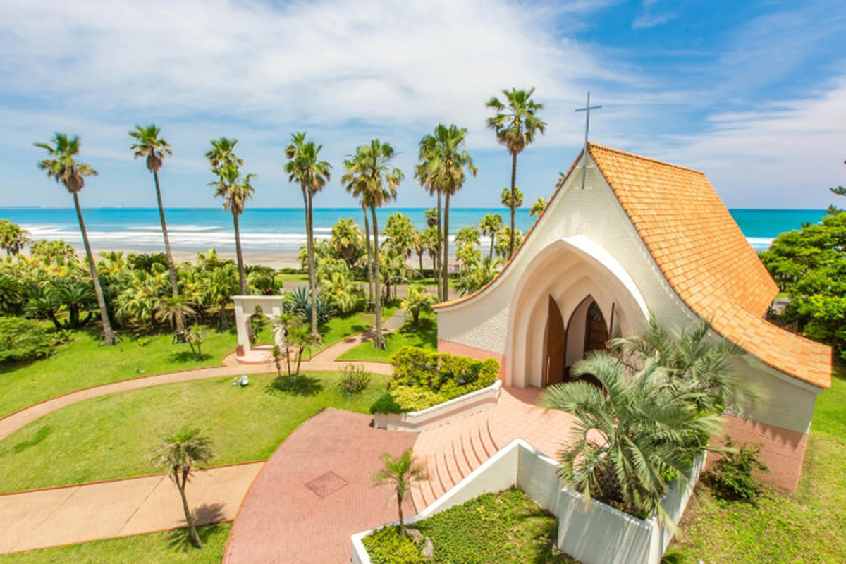 A freestanding chapel surrounded by palm trees, bathed in bright sunshine, sets the stage for the couple’s special day.As the doors open, the aisle leads to breathtaking views of the ocean and sky of Aoshima, unfolding before you.Just like the endless sea and sky, may your future together be filled with boundless blessings.In this open and scenic setting, couples can experience a deeply moving wedding ceremony framed by nature’s beauty.