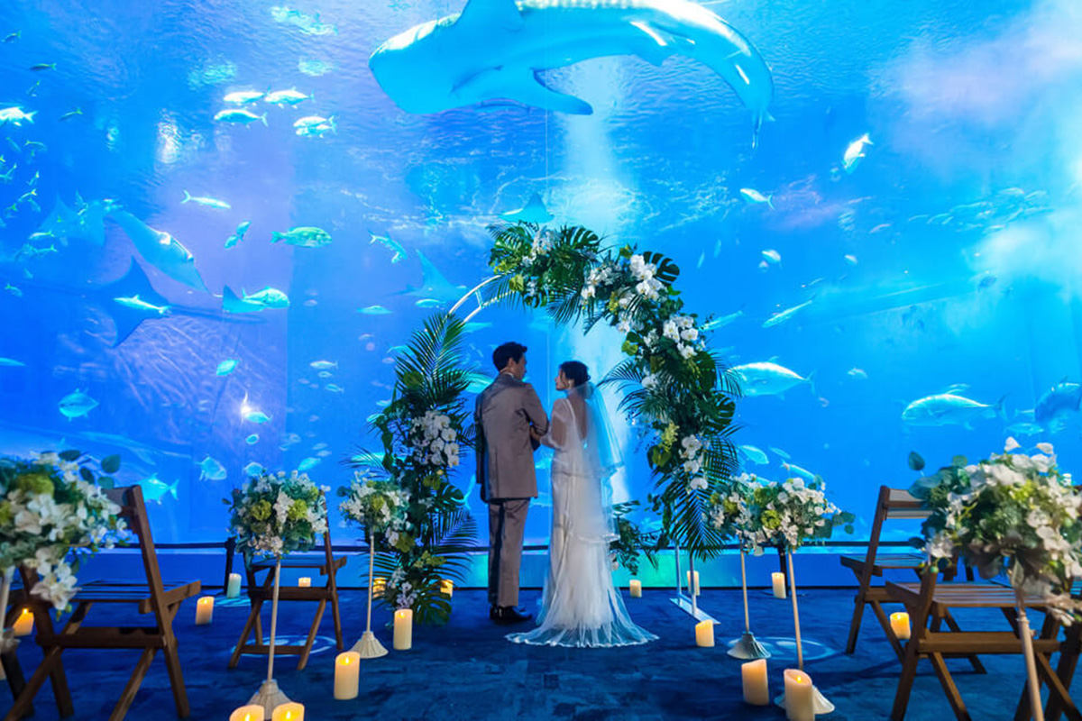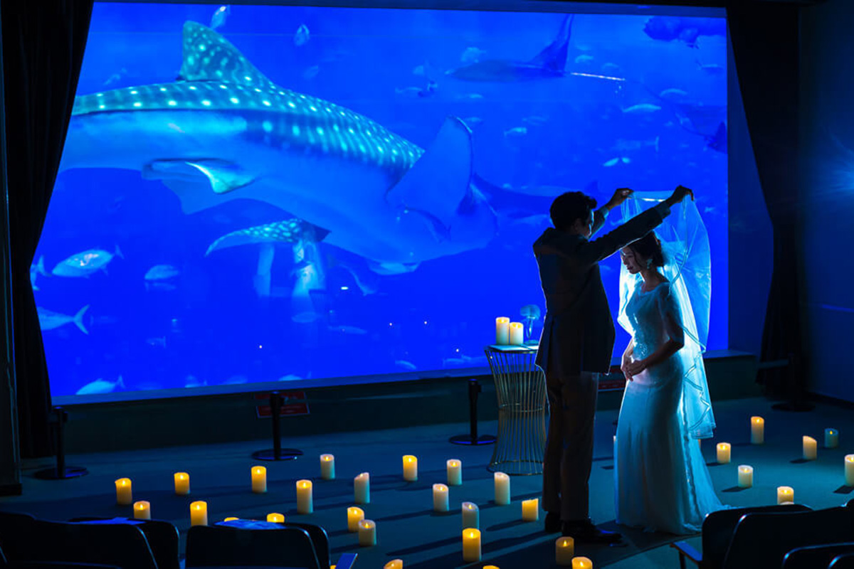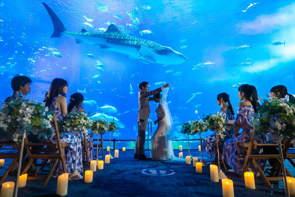 A private wedding experience at Okinawa’s Churaumi Aquarium, where you can fully immerse yourself in the beauty of the ocean.Enjoy a one-of-a-kind wedding ceremony held in front of the “Kuroshio Sea” tank, where majestic whale sharks and manta rays glide gracefully, creating a truly unforgettable backdrop.The experience also includes location photo shoots amid Okinawa’s magnificent natural landscapes, offering a once-in-a-lifetime celebration that can only be found here.